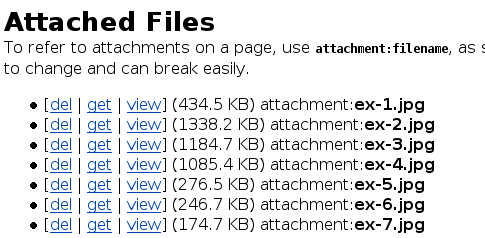 Um Dateianhänge in eine Seite einzufügen sollte unbedingt eine Angabe wie attachment:dateiname benutzt werden, wie sie auch in der folgenden Liste der Dateien erscheint. Es sollte niemals die URL des Verweises ("laden") kopiert werden, da sich diese jederzeit ändern kann und damit der Verweis auf die Datei brechen würde.